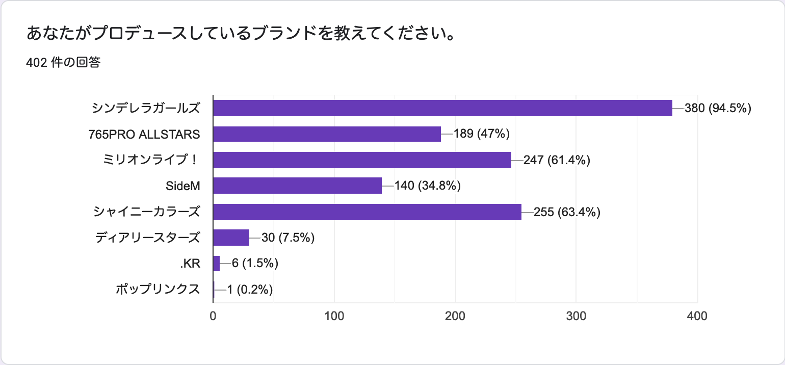 これらの結果は、「ファンアカウントが実施したアンケートで、回答者はアイドルマスターとくに『シンデレラガールズ』について熱量が高い」という前提がありますことをご承知おきください。