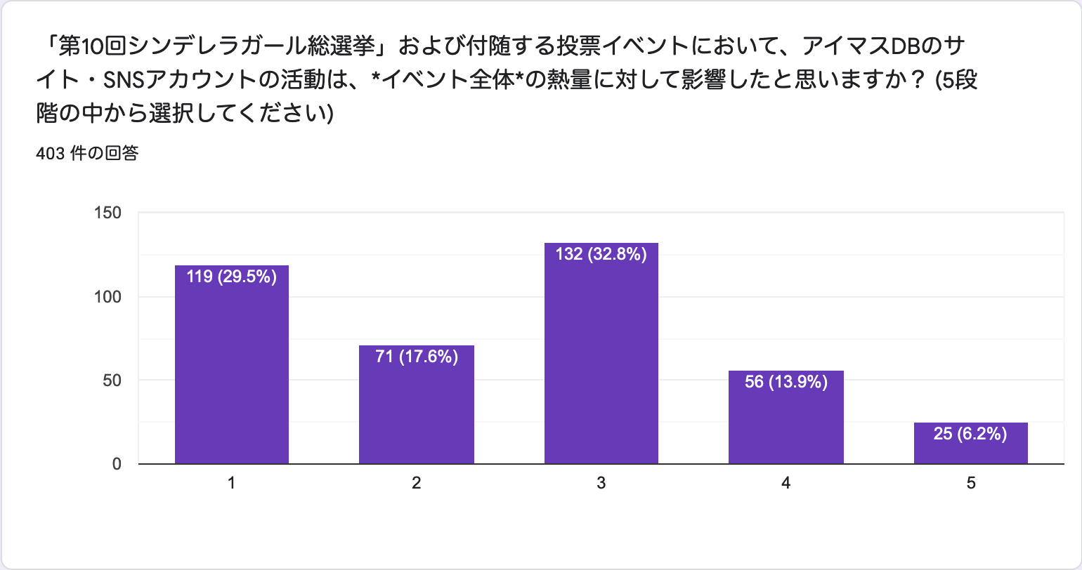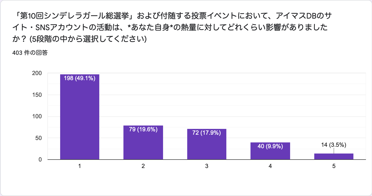 Q. 「総選挙」イベントにおいて、アイマスDBのサイト・SNSアカウントの活動は、*あなた自身*の熱量に対してどれくらい影響がありましたか?