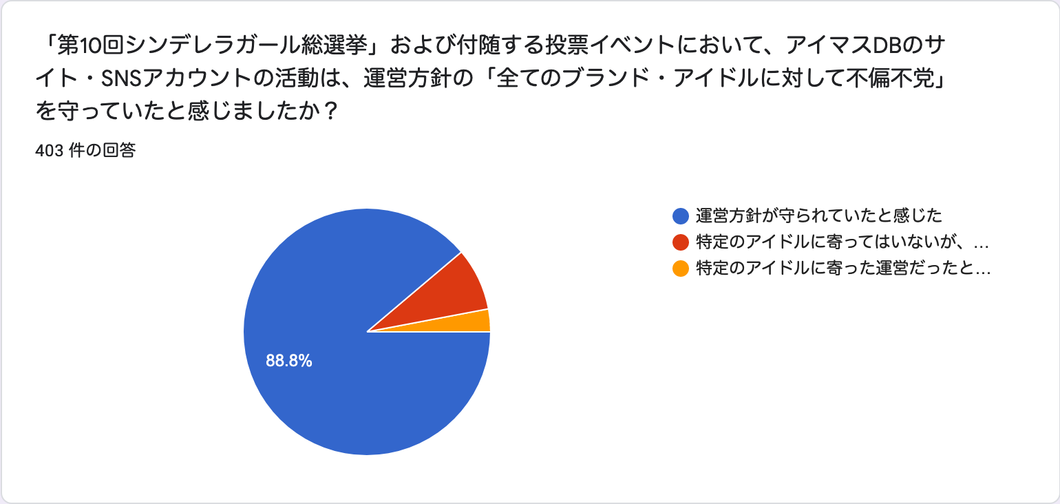 Q. 「総選挙」イベントにおいて、アイマスDBのサイト・SNSアカウントの活動は、運営方針の「すべてのブランド・アイドルに対して不偏不党」を守っていたと感じましたか?
